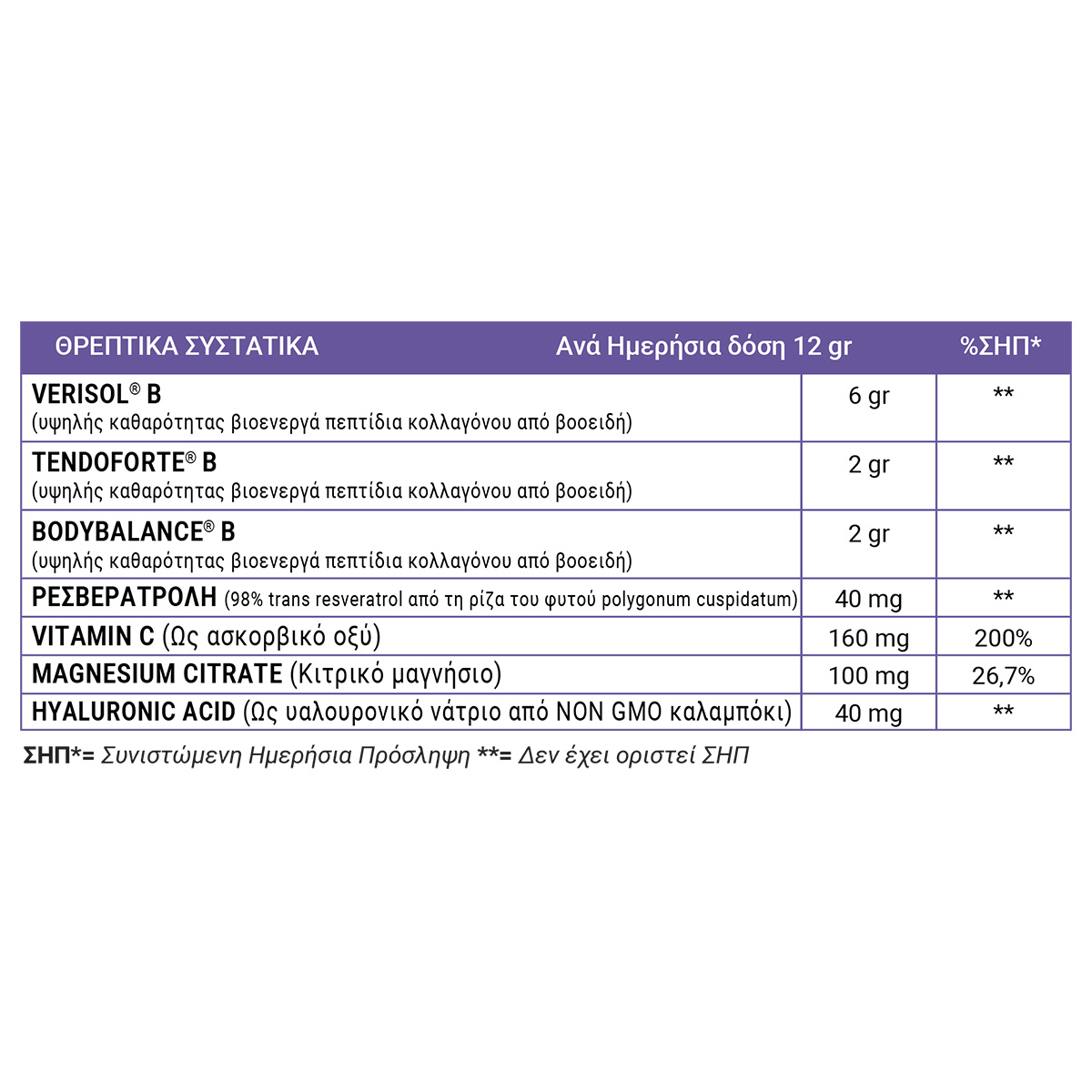 Συμπλήρωμα διατροφής με βιοενεργά πεπτίδια κολλαγόνου, Υαλουρονικό οξύ, Ρεσβερατρόλη, Βιταμίνη C και μαγνήσιο.