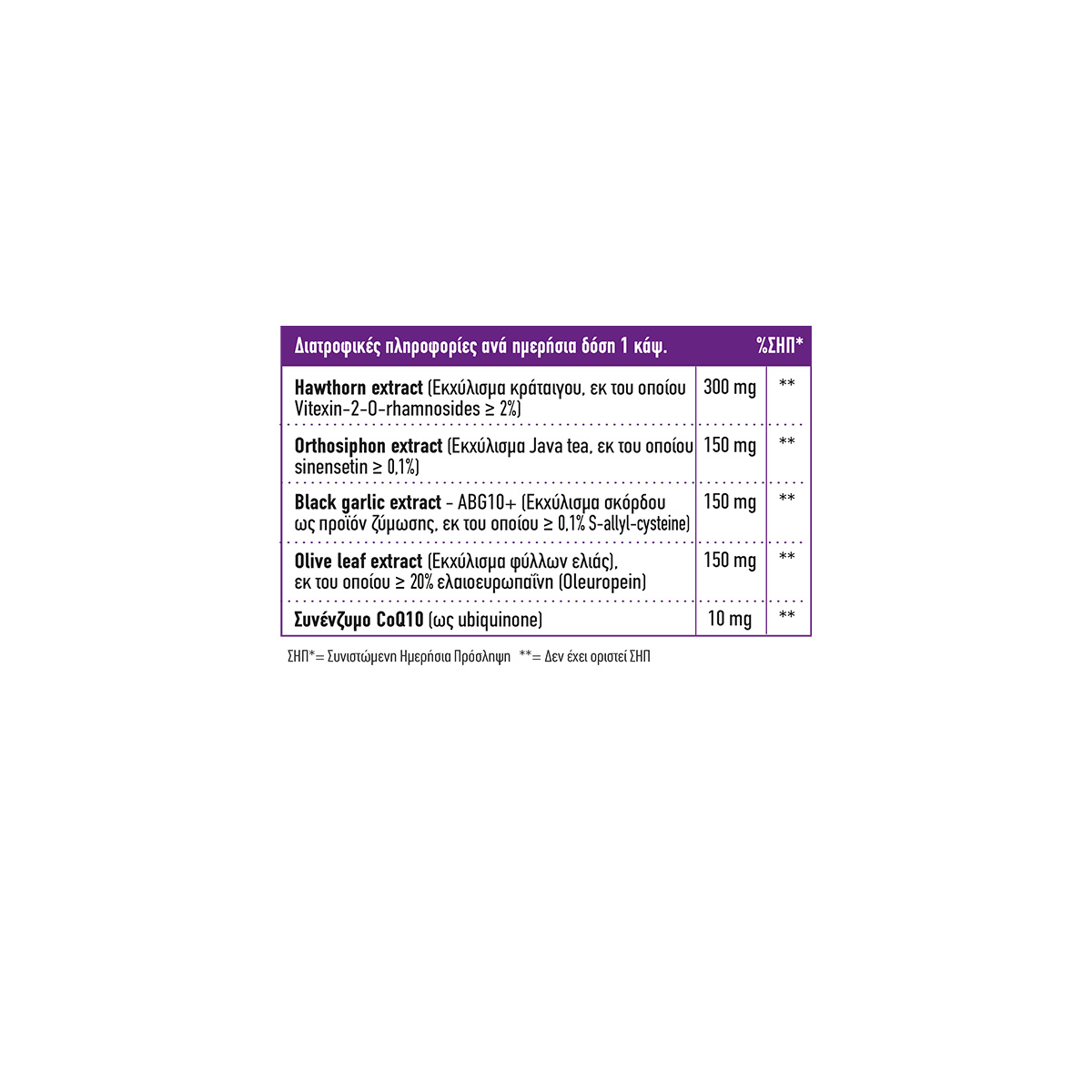 Συμπλήρωμα διατροφής με εκχύλισμα κράταιγου, java tea, μαύρο σκόρδο και συνένζυμο Q10.