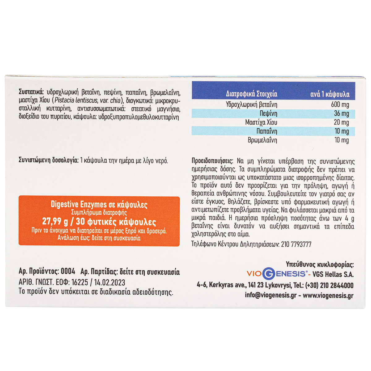 Βασικά συστατικά: υδροχλωρική βεταΐνη, πεψίνη, παπαΐνη, βροµελίνη, μαστίχα