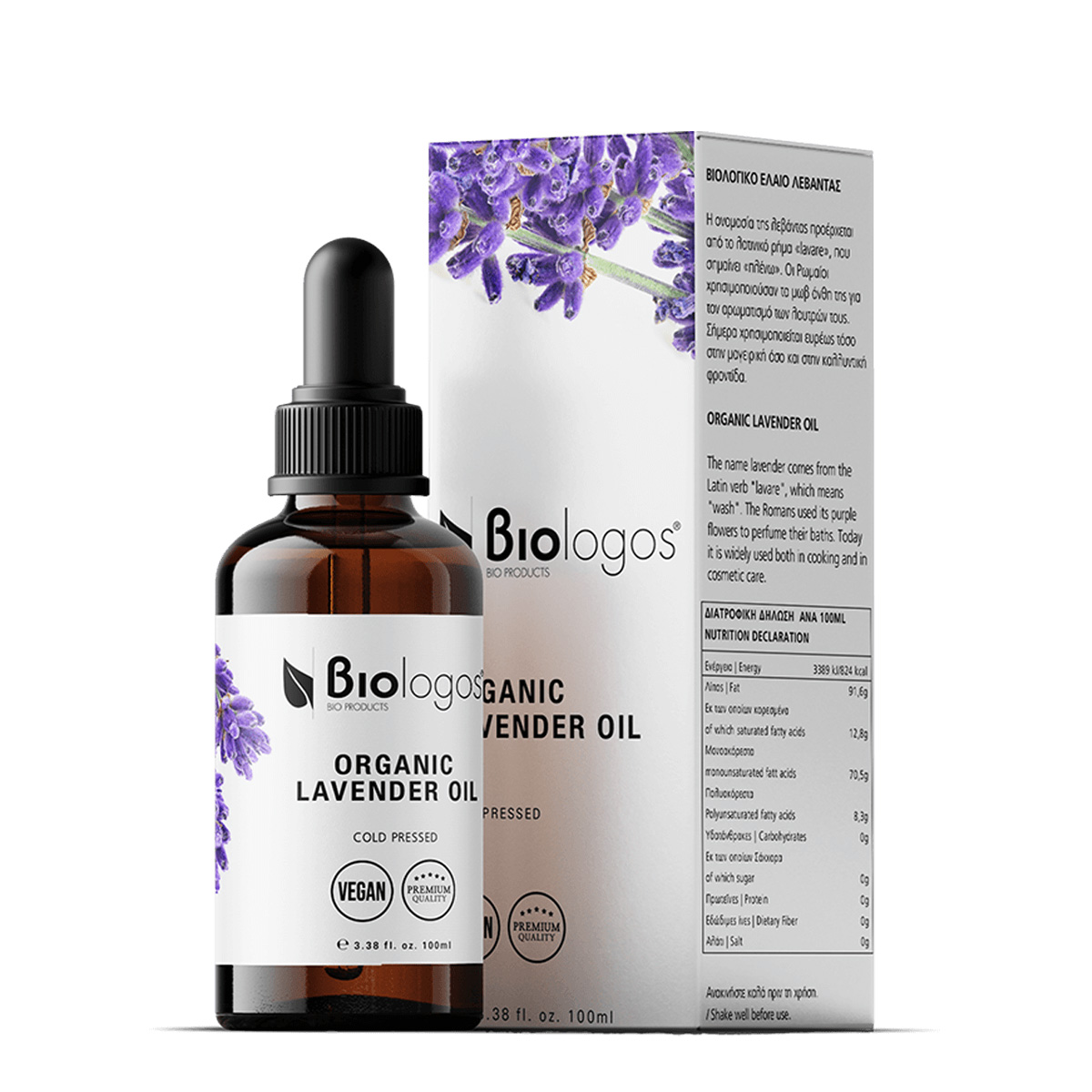 98% Βιολογικό έξτρα παρθένο ελαιόλαδο, 2% Βιολογικό αιθέριο λεβάντας.