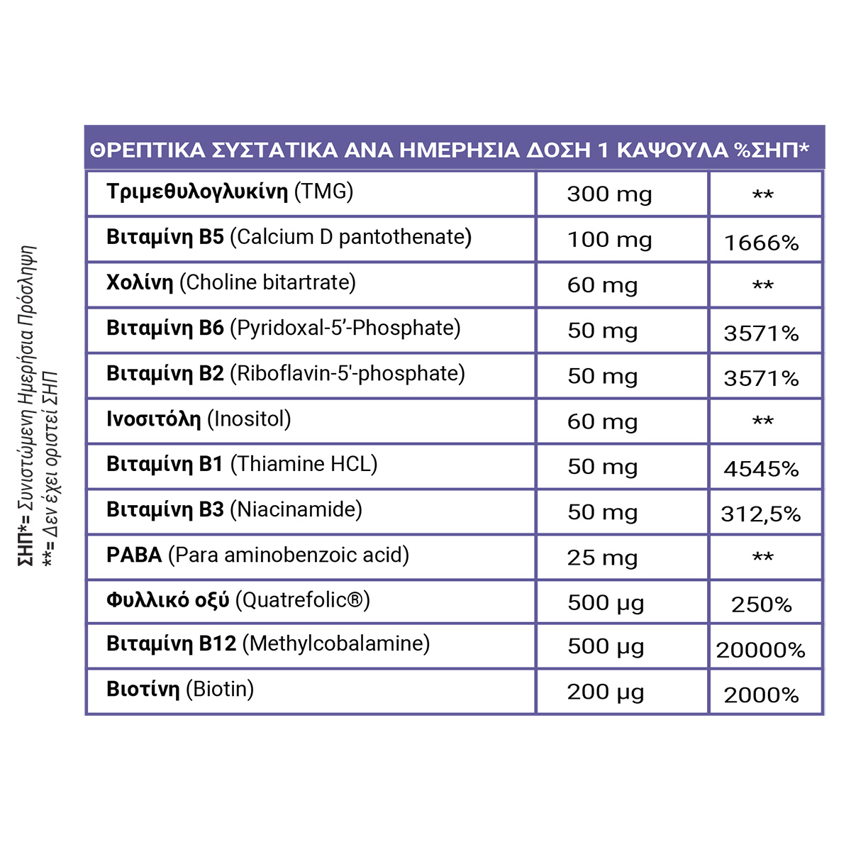 Συμπλήρωμα διατροφής με τις βιταμίνες τους συμπλέγματος Β στην ενεργή τους μορφή, TMG, χολίνη και ινοσιτόλη. Συμβάλλει: