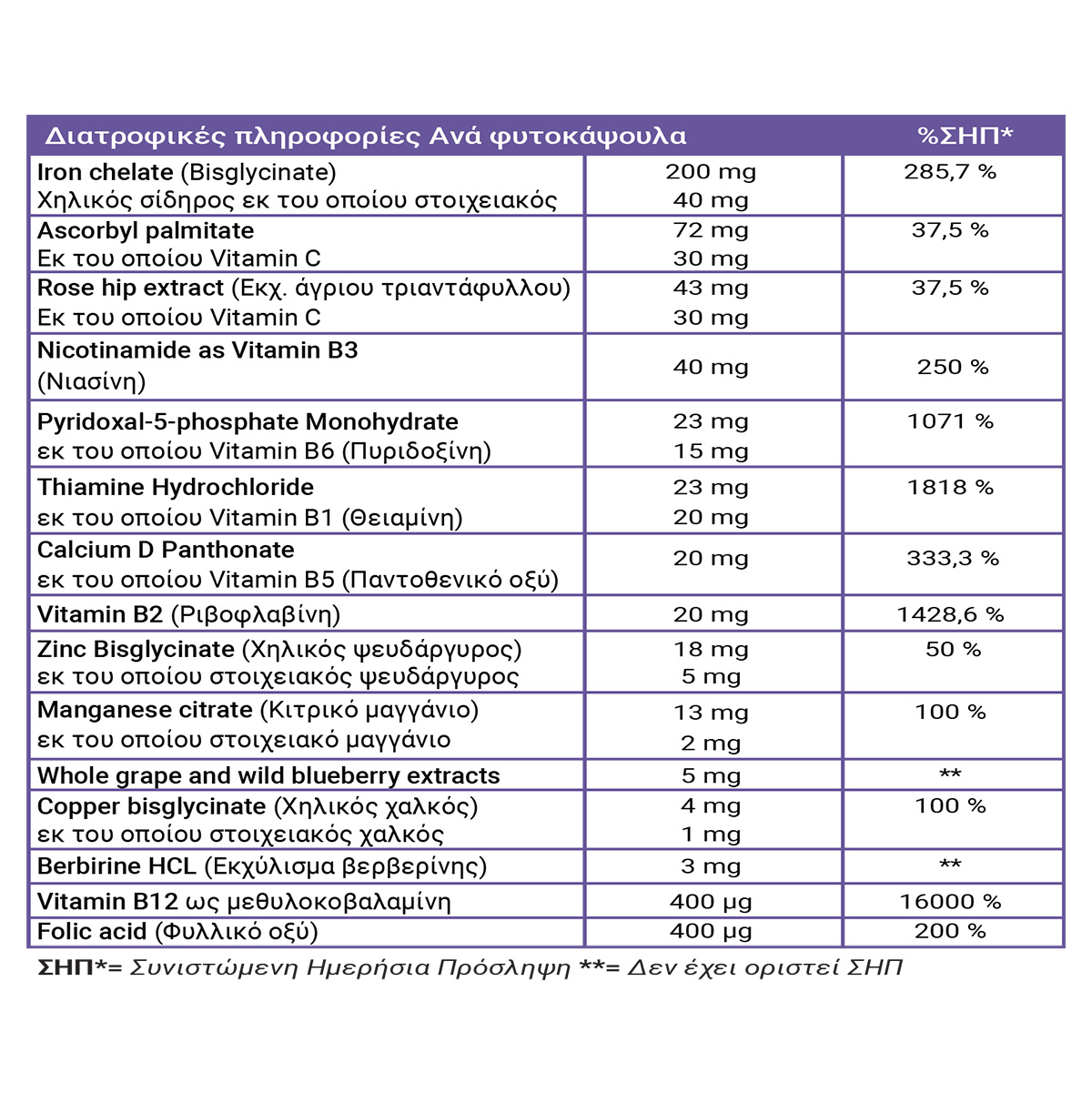 ΔΡΑΣΤΙΚΑ ΣΥΣΤΑΤΙΚΑ: Χηλικός σίδηρος, ascorbyl palmitate (πηγή βιταμίνης C), εκχύλισμα από άγριο τριαντάφυλλο, νιασίνη(από νικοτιναμίδιο), βιταμίνη B6(από 5′-φωσφορική-πυριδοξάλη), βιταμίνη B1(από υδροχλωρική θειαμίνη), παντοθενικό οξύ(από παντοθενικό ασβέστιο), Βιταμίνη B2 (ριβοφλαβίνη), χηλικός ψευδάργυρος, κιτρικό μαγγάνιο, σταθεροποιημένο μείγμα μούρων, χηλικός χαλκός, εκχύλισμα βερβερίνης, βιταμίνη B12(ως μεθυλοβαλαμίνη), φυλλικό οξύ