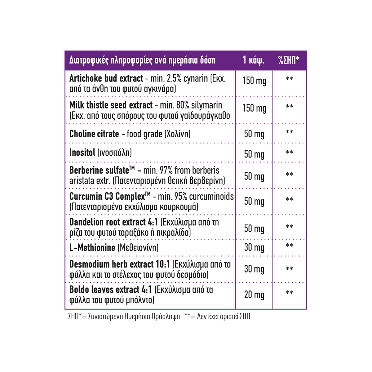 Συμπλήρωμα διατροφής με φυτικά εκχυλίσματα (γαϊδουράγκαθο, αγκινάρα, ταραξάκο, δεσμόδιο, μπόλντο), παραδοσιακά χρησιμοποιούμενα για την υποστήριξη της ηπατικής λειτουργίας**, και χολίνη, η οποία συμβάλλει στη φυσιολογική λειτουργία του ήπατος. * Περιέχει επίσης βερβερίνη, ινοσιτόλη, κουρκουμίνη και L-μεθειονίνη.