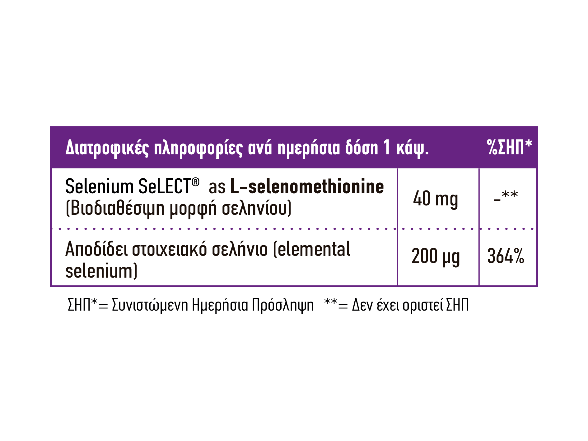 Συμπλήρωμα διατροφής με την βιοδιαθέσιμη μορφή του σεληνίου ως L-selenomethionine.