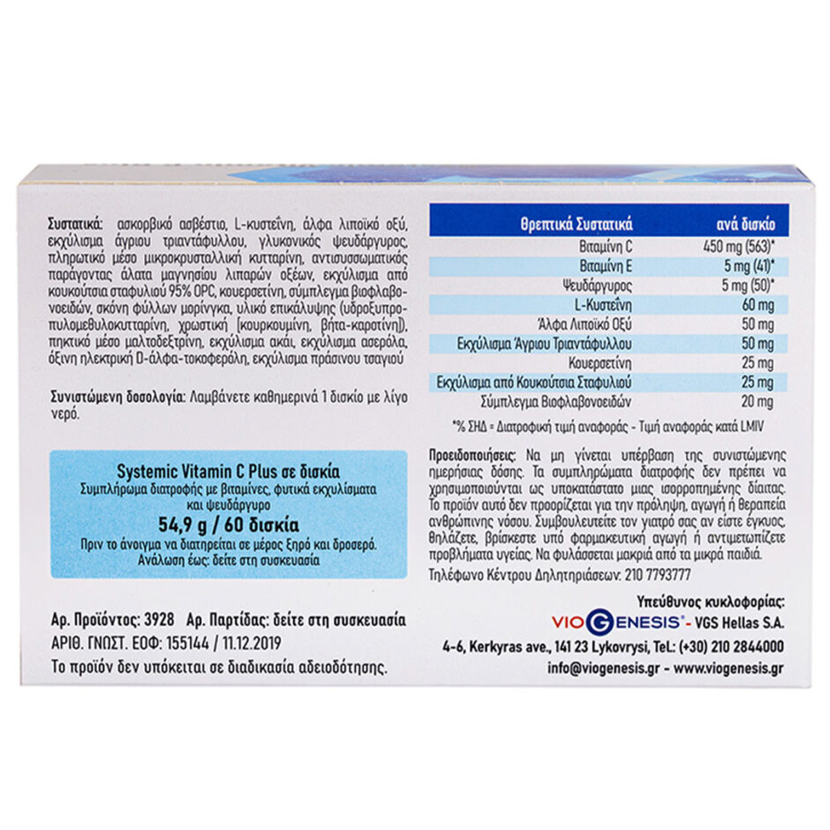Vegan Systemic Vitamin C Plus 915 mg Viogenesis 60 ταμπλέτες