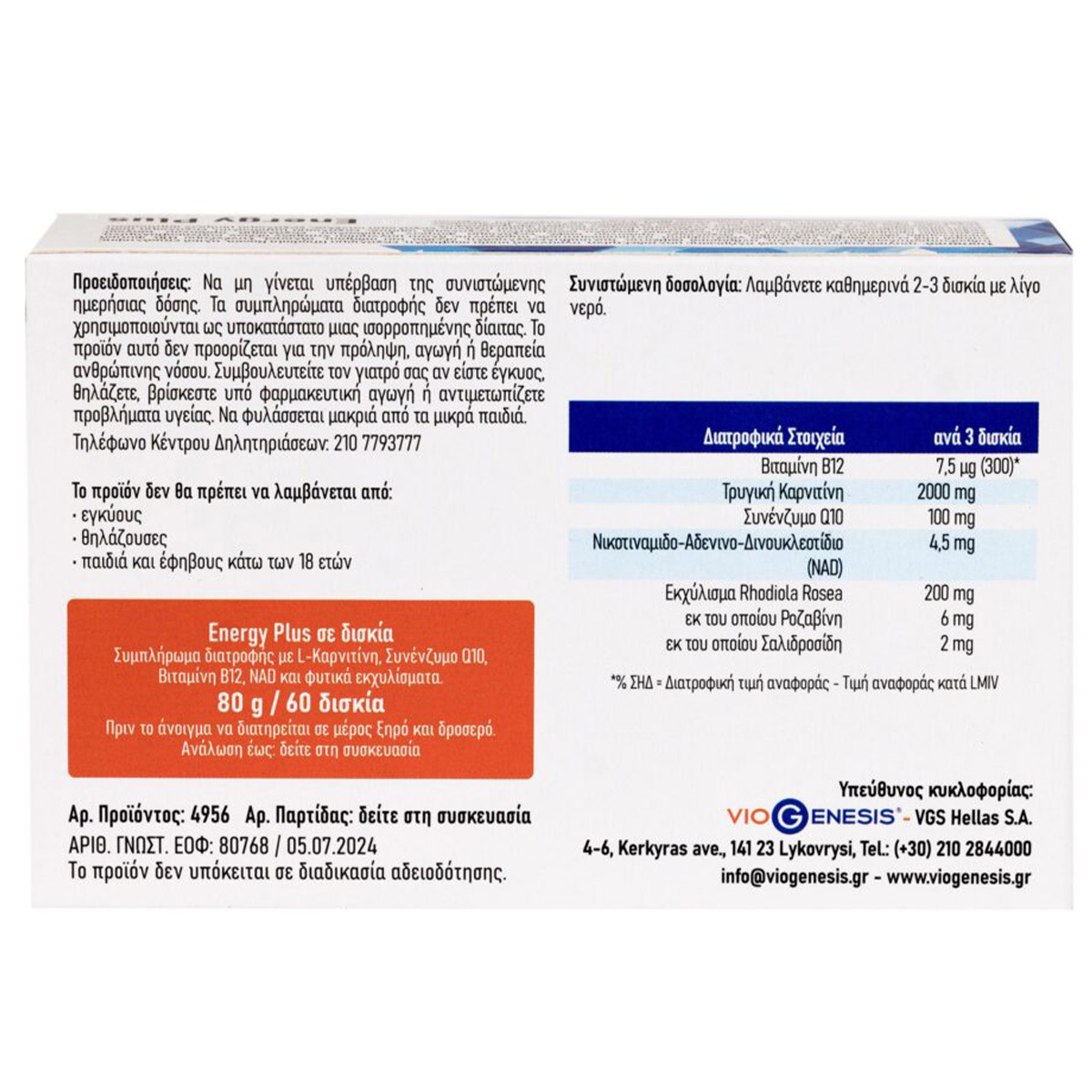 To VioGenesis Energy Plus είναι μια φόρμουλα με συνένζυμο Q10, NAD, Rhodiola Rosea, L-καρνιτίνη και βιταμίνη Β12. Χάρη στη σύνθεσή του, το VioGenesis Energy Plus, συμβάλλει στη φυσιολογική λειτουργία των μεταβολικών διεργασιών που αποσκοπούν στην παραγωγή ενέργειας.