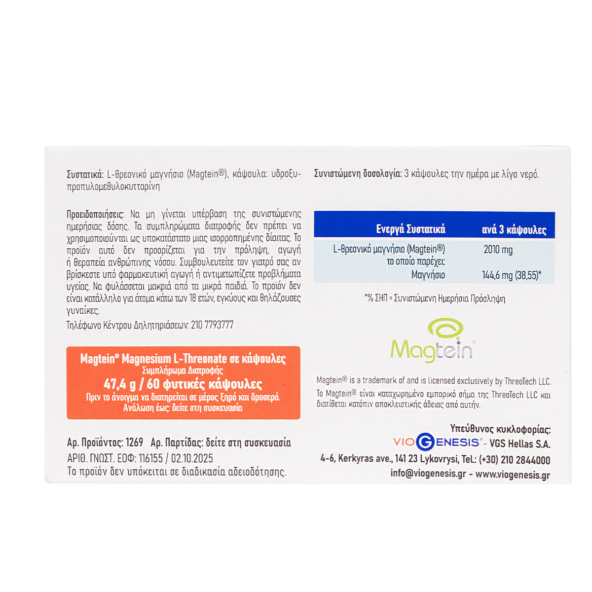 Το Viogenesis Magtein® Magnesium L-Threonate είναι ένα συμπλήρωμα διατροφής που περιέχει 2010 mg L-θρεονικό μαγνήσιο ανά δόση, τα οποία αποδίδουν 144,6 mg μαγνήσιο.