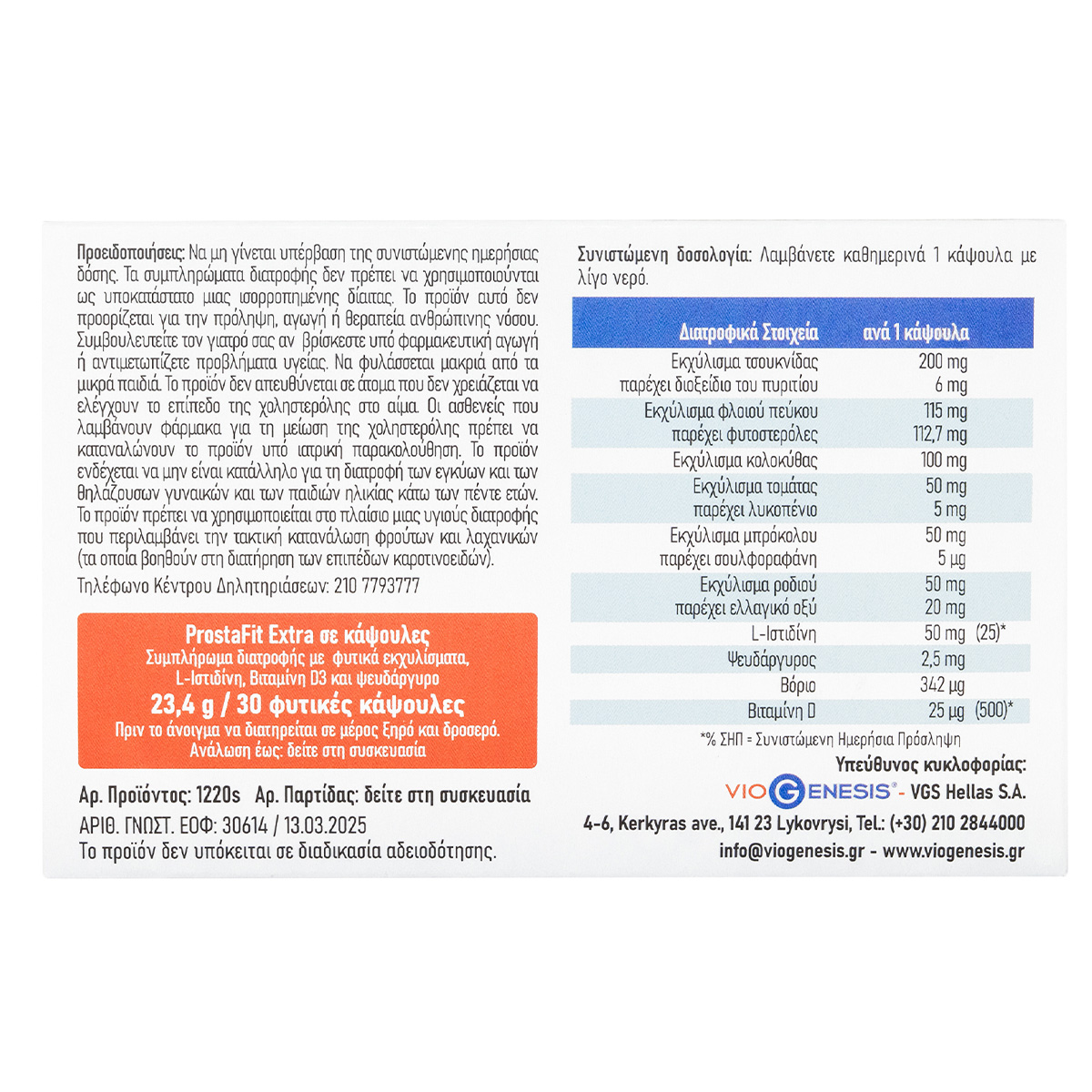 To VioGenesis ProstaFit Extra είναι μια φόρμουλα με φυτικά εκχυλίσματα τσουκνίδας, φλοιού πεύκου, σπόρων κολοκύθας, τομάτας, μπρόκολου και ροδιού, L- ιστιδίνη, χοληκαλσιφερόλη, βόριο και ψευδάργυρο. Χάρη στη σύνθεσή του, το VioGenesis ProstaFit Extra συμβάλλει στη διατήρηση της φυσιολογικής λειτουργίας του προστάτη, των φυσιολογικών επιπέδων τεστοστερόνης στο αίμα και τη φυσιολογική γονιμότητα και αναπαραγωγή.