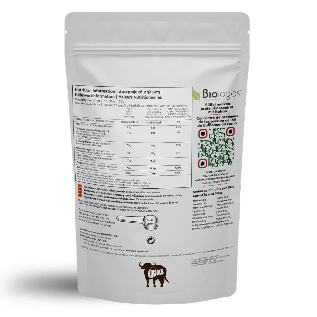92% Βουβαλίσια πρωτεΐνη ορού γάλακτος συμπυκνωμένη, 8% κακάο σκόνη.